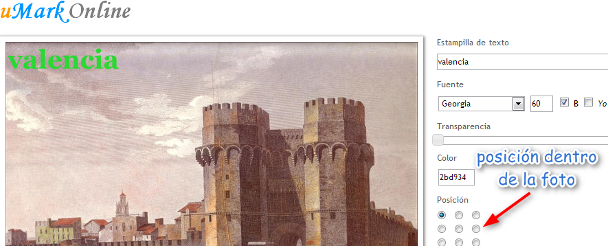 uMark Online - aplicación gratuita que nos permite crear una marca de agua en la foto, es decir escribir dentro de ella. No hace falta registrarse, solamente subir un archivo, también podemos hacerlo en bloque.