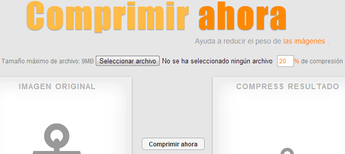 Compressnow - podemos elegir el tanto por ciento a comprimir en una foto, muy útil para reducir el tamaño de carga y ocupar menos espacio a la hora de enviarlo por email o colocarlo en alguna red social. No se modificará ni el ancho ni el alto de la foto. Reconoce archivos gif, jpg, jpeg, png.